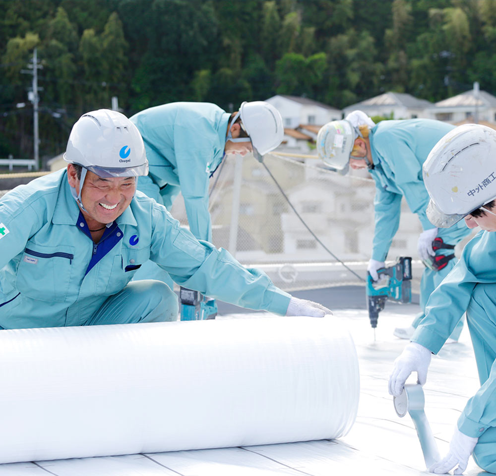 中外商工ブランドを支える防水工事。塩ビシートをはじめ多様な工法に対応し、品質と安全性を第一に丁寧な施工を行います。